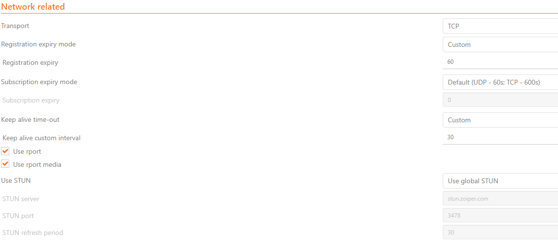 A screenshot of the 'Network related' section of the Advanced Settings in Zoiper.